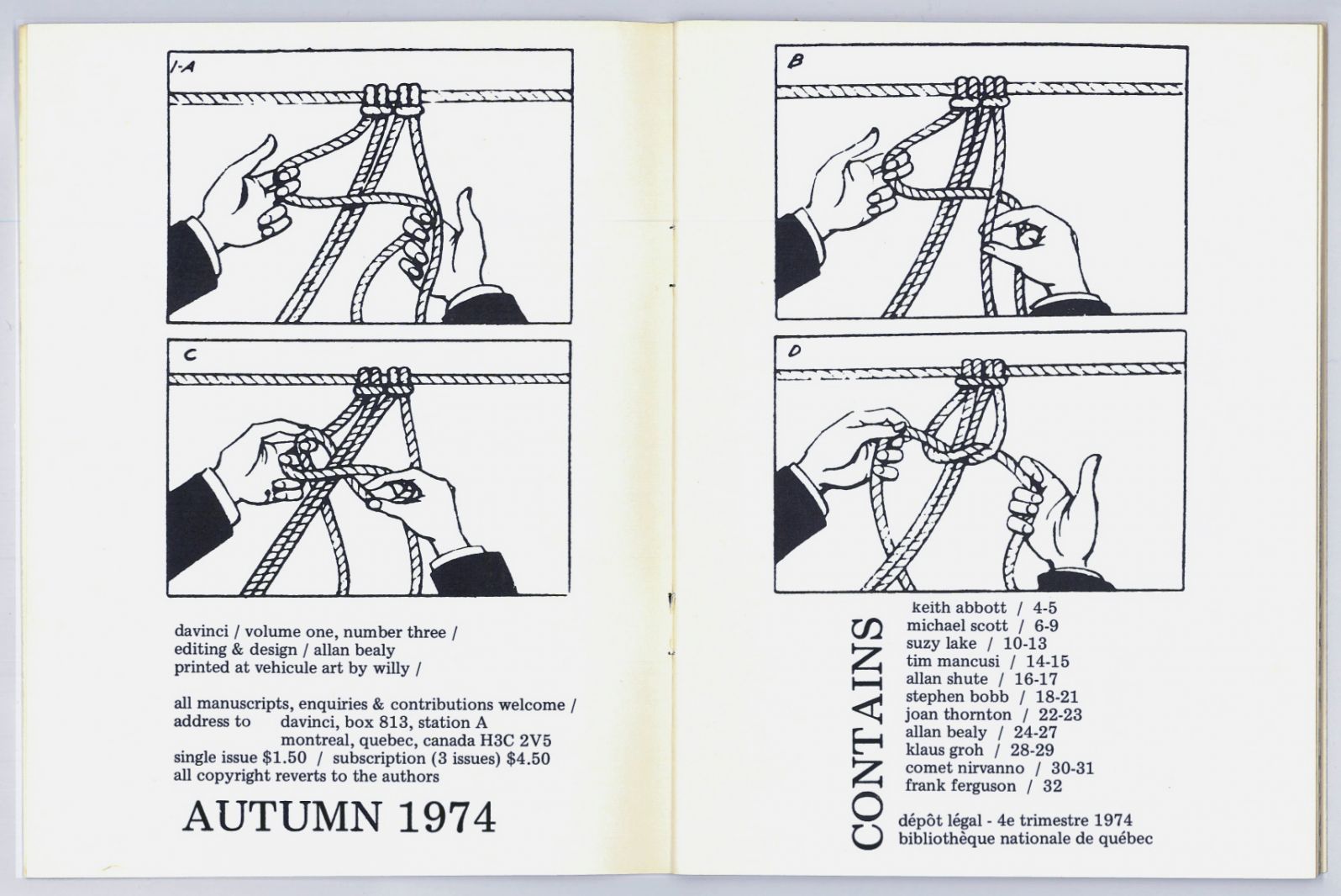 For this edition of One Hour, One Book, Louis Rastelli will present one issue of davinci, a short-run periodical published in Montreal in the mid 1970s that featured the work of dozens of local poets, writers and visual artists of varied disciplines. A great many well-known artists, such as Suzy Lake, Bill Vazan, John Heward and more, contributed to this small but explosive publication. After davinci released its final issue in 1975, Allan Bealy, the magazine’s editor, moved on to become a highly regarded collage artist in New York. Rastelli will discuss how impressively this little publication (which was produced barely one block West of Artexte) brings one back to a specific time in the arts in Montreal, how it prefigured many free-form “zines,” and how its artistic content resonates in the present.