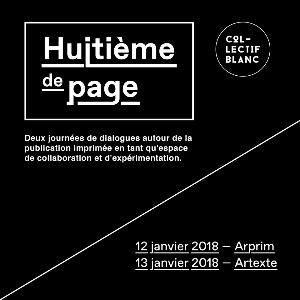 In the context of the exhibition Édition / Forme / Expérimentation, presenting the work of fifty Canadian and international artists working with books and publishing, Arprim, centre d’essai en art imprimé, Collectif Blanc and Artexte invite you to Huitième de Page, two days of conversation around printed publications as a space of collaboration and experimentation.