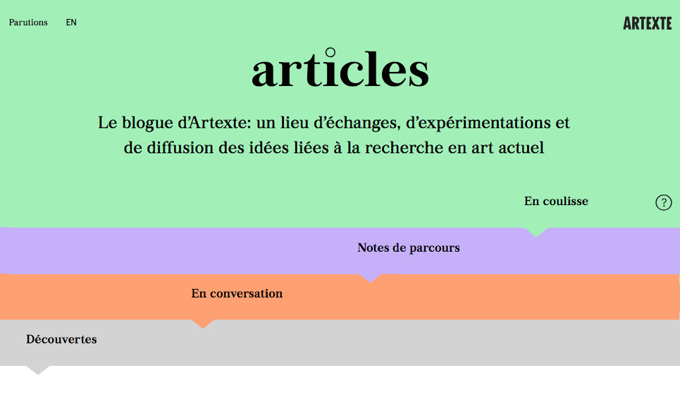 Recently launched, the blog articles presents accessible and varied content, serving as a site for exchange, experimentation and dissemination of ideas related to contemporary art research. Stemming from Artexte’s mission, articles is a platform for the creation and sharing of critical content in the field of visual arts. articles is also a tool for understanding and interpreting Artexte’s collection, built by and for the community. In order to reflect the research interests of the researchers who use the collection, the blog is written by employees, interns, volunteers as well as researchers in residence, and is open to guest authors and anyone interested in contributing.