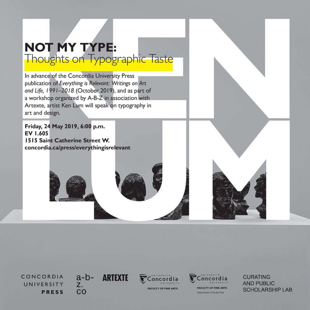 In advance of the Concordia University Press publication of Everything is Relevant: Writings on Art and Life, 1991–2018 (October 2019), and as part of a workshop organized by A-B-Z in association with Artexte, artist Ken Lum will speak on typography in art and design. Free and open to the public!