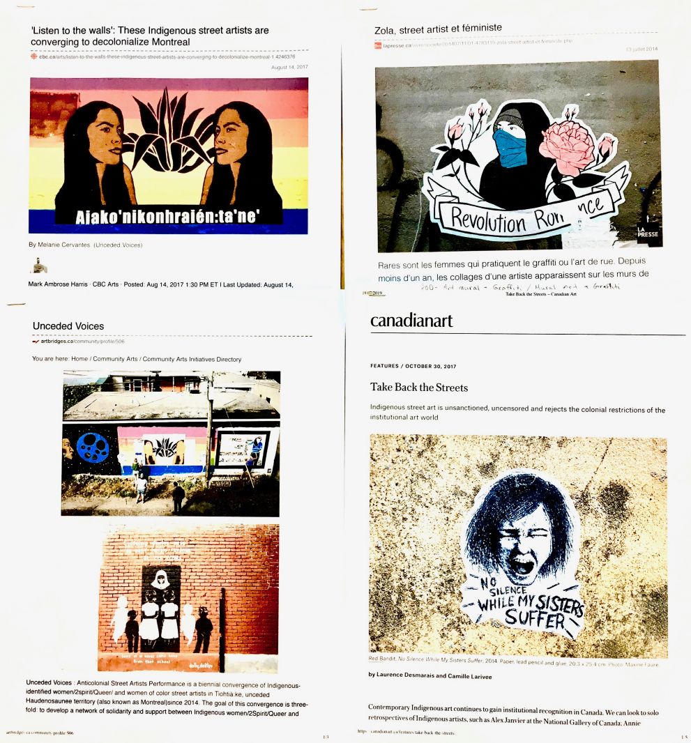 Camille Larivée is a street artist, independent curator, writer and cultural worker based in Tiohtià:ke / Mooniyaang, unceded Haudenosaunee and Anishinabe territories (Montreal, QC). She holds a bachelor’s degree in Art History and a Certificate in Women’s Studies from Université du Québec à Montréal (UQAM). She co-founded the collective Unceded Voices / Les Voix Insoumises in 2014, a convergence that works on the invisibility of Indigenous and women of color, 2Spirit and Queer women artists and muralists in Montreal’s urban space. Having recently completed the coordination of the Tiohtià:ke Project, an ambitious two-year cycle of exhibition and curatorial programming bringing together Indigenous artists and curators from Quebec and elsewhere for the Aboriginal Curatorial Collective / Collectif des Commissaires Autochtones (ACC–CCA), Camille continues to work for ACC-CCA where she is now the Director of Programming.