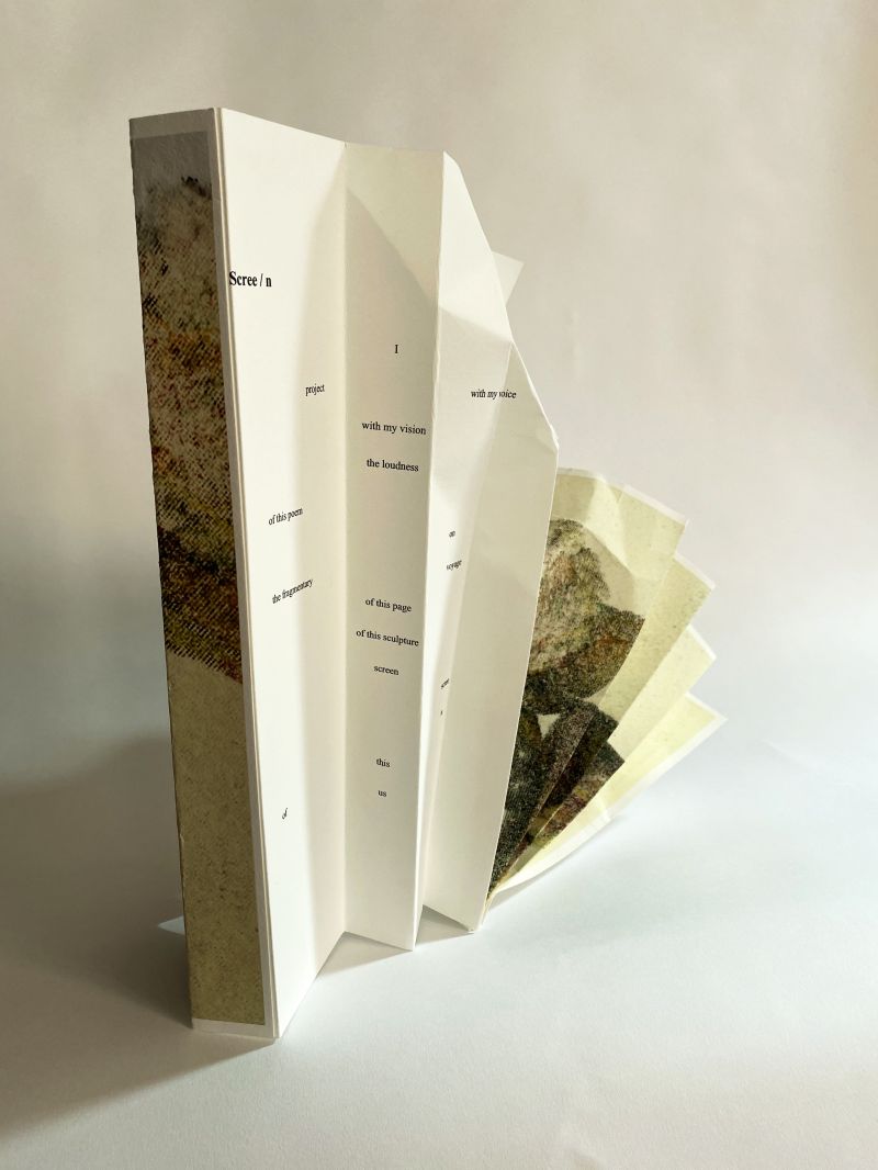 Researching the artists’ book in Artexte expansive archival collection during a month-long, virtual residency in May 2021, visual artist Kadie Salmon (London, U.K.) and poet Klara du Plessis (Montreal) have responded with their own —conceptualizing the artists’ book as a series of paper sculptures or pages. Their book contains three main sections —Incipit, Scree, and Explicit— integrating elements from twenty new poems onto the visual page as medium. The sculptural progression of pages is often malleable, transforming into a variety of tactile poses that embody the flexibility of literary and fine arts interpretation. This new work challenges assumptions of what defines the book as object, form, and content as it changes shape and pushes back against the expectation of readable script.