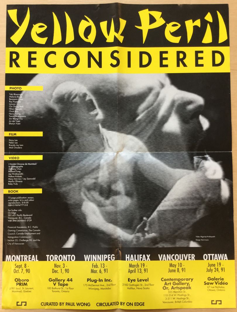 Curated by media artist Paul Wong, Yellow Peril: Reconsidered was one of the first major exhibitions devoted entirely to the works of Asian Canadian artists working in the mediums of photography, video, and film. Throughout 1990 and 1991 the exhibition toured artist-run centres in Halifax, Montréal, Ottawa, Toronto, Winnipeg, and Vancouver, examining historical and contemporary representations of Asian Canadians and highlighting the works of twenty-five artists of Chinese, Japanese, Korean, Vietnamese, and Filipino descent.[8]8 (1990). Yellow Peril: Reconsidered. The intent of the exhibition, and its accompanying catalogue and public programming, was to explore the complexities of establishing a pan-Asian diasporic network; to present critical views by Asian Canadians rather than defining or generalizing Asian Canadian experience.
