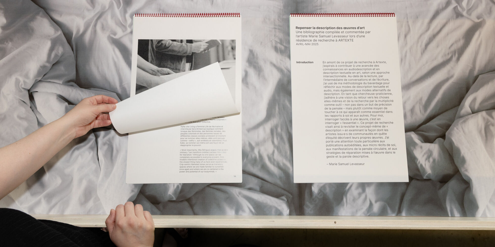 Artexte For your residency project here at Artexte, you explore text and audio description in art from an intersectional approach. Can you tell us what led you to this area of research? And what made you want to revisit the idea of “description” in the art context?