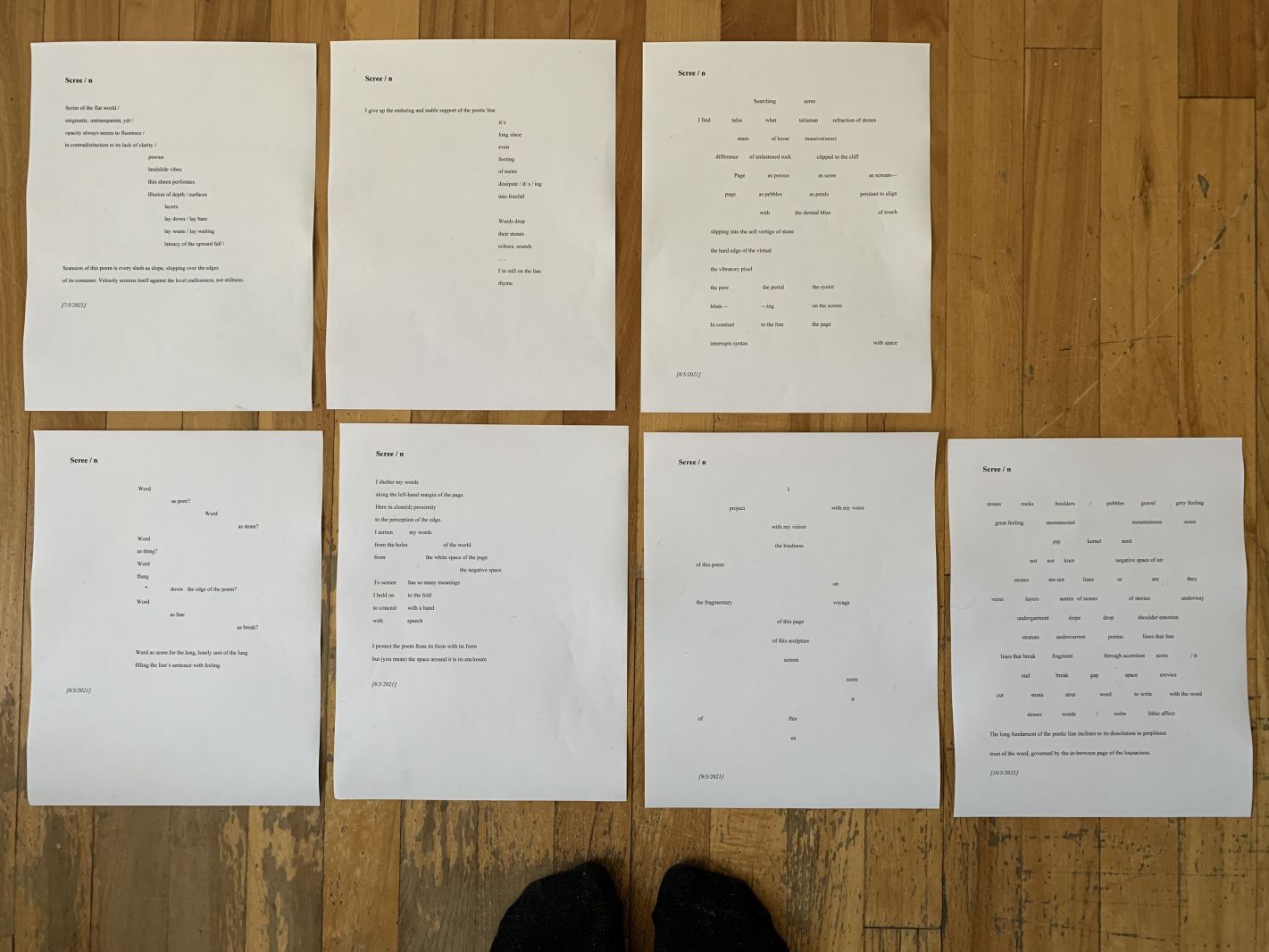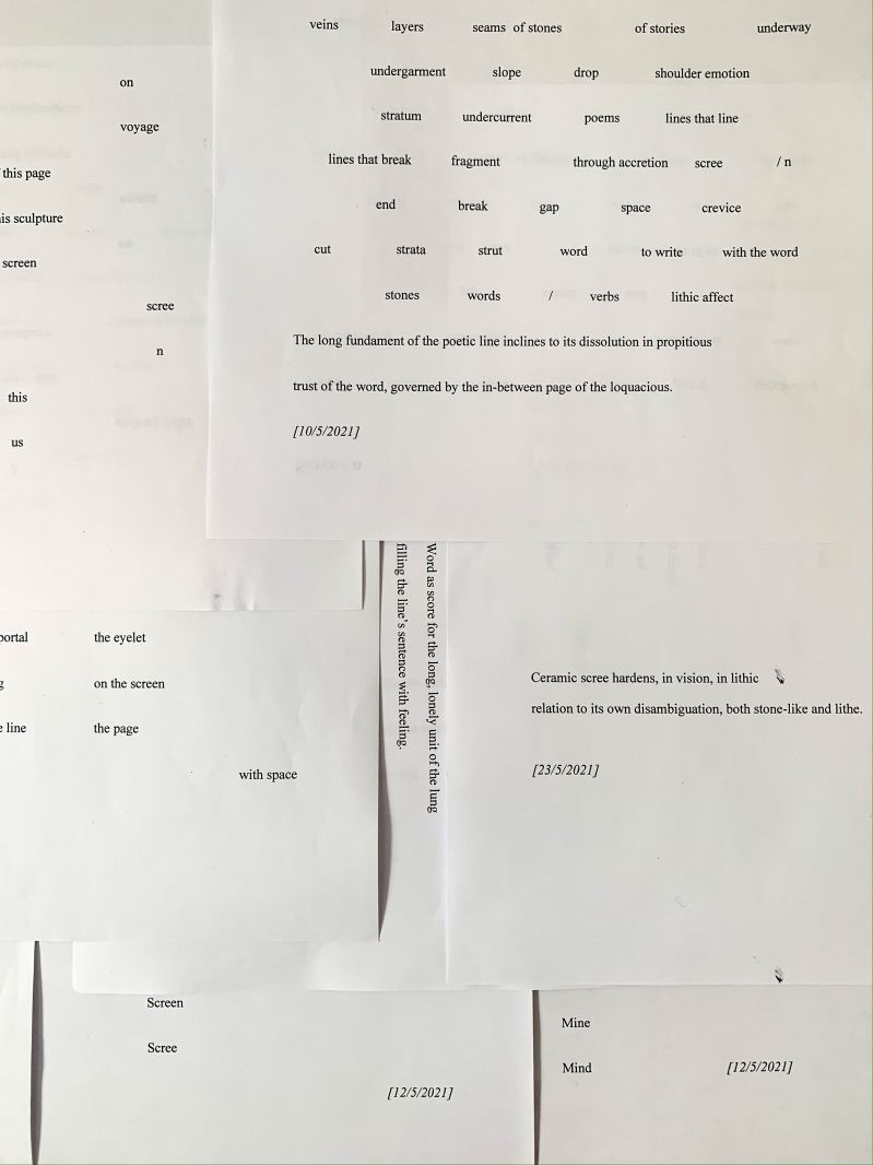 Exploration of how our artist book(s) may reference scree—a collection of fragments and ideas building, balancing and transforming.