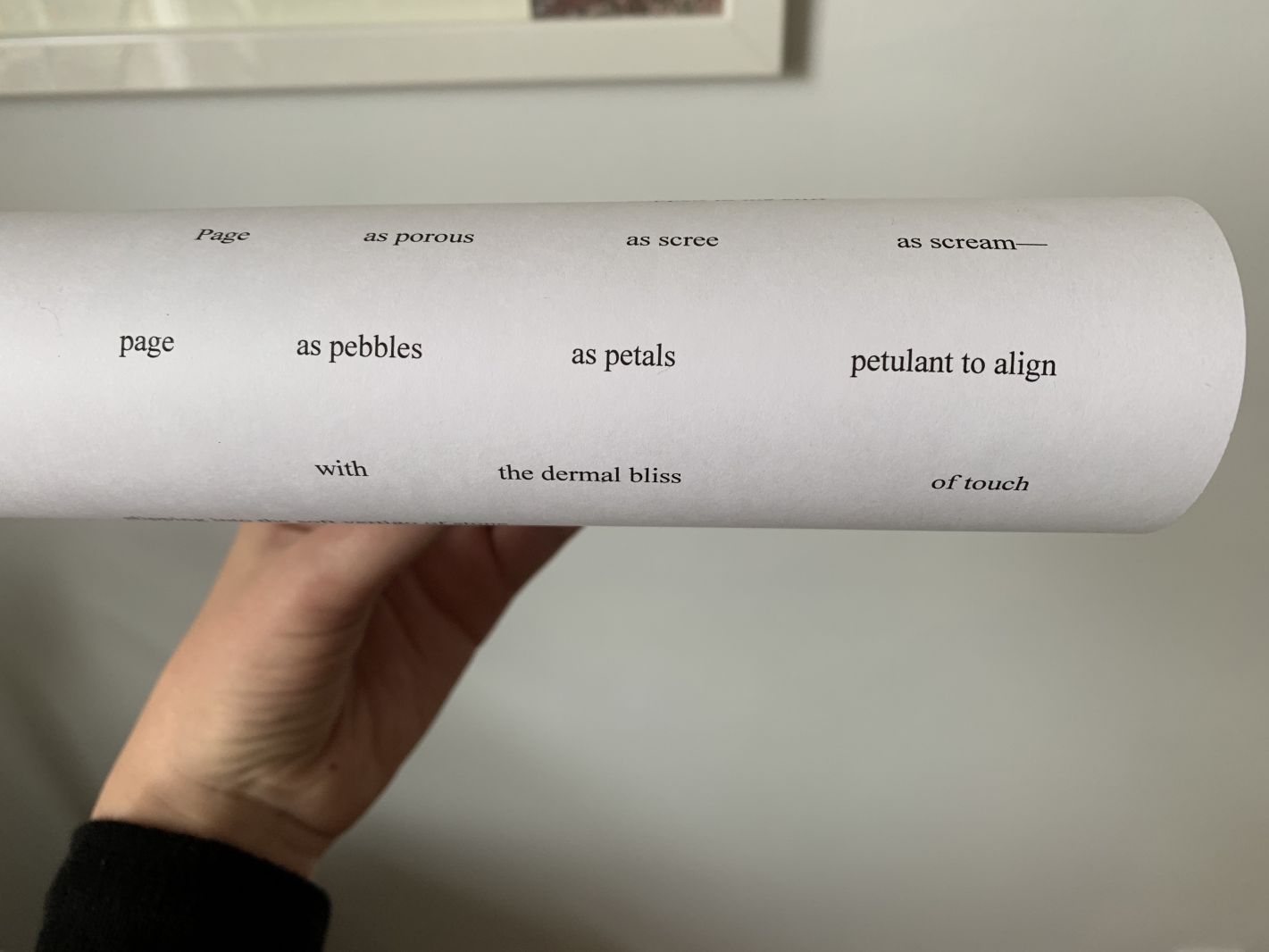 We are considering, though, whether there might be an adjacent form of documentation we might create alongside the artists’ book to print or somehow share the poems as raw materials before they were transformed into the visual production of the sculptures. I will probably also read some of these poems during our lecture performance in June.