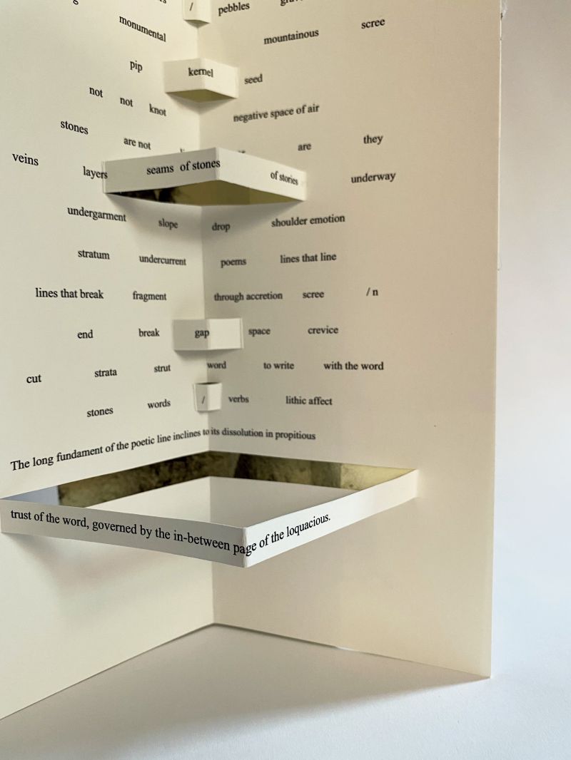 In “Incipit,” our research focussed on questioning the essence and structure of the artists’ book—deconstructing the book’s traditional form through a sequence of poses exploring surface and movement. “Scree” consists of three separate sculptures—“Concertina,” “Cut-outs” and “Boulders”—and was made in direct conversation with Klara’s sequence of “Scree” poems. However, in “Scree” our explorations shifted somewhat and returned back to the book’s content—the page and how the word and line occupy space. These sculptures are more architectural in form and are the result of various physical manipulations of the page- through cutting, folding or coating in papier-maché.