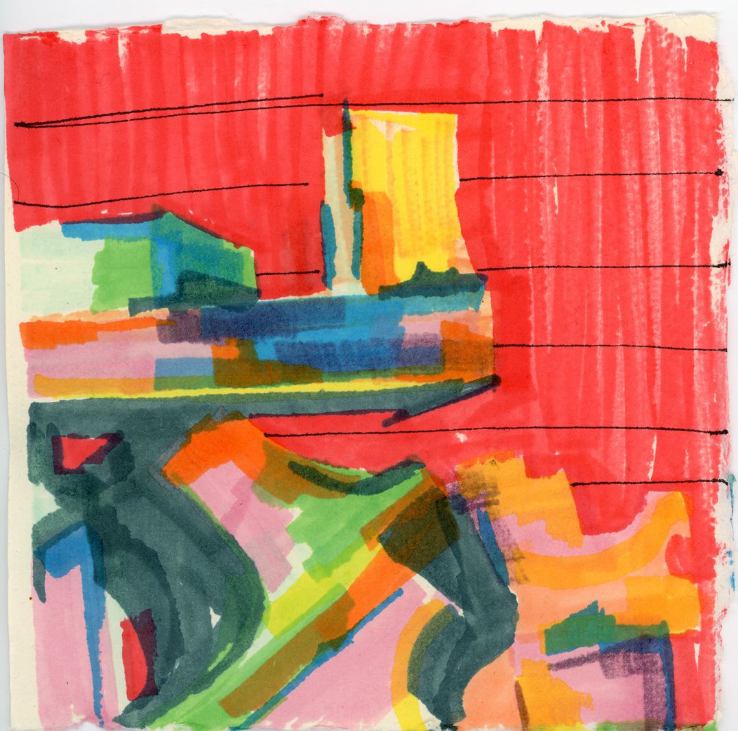 An on-site drawing done on handmade paper with marker pens. This is 1 of 15 colour studies, exploring the surrounding landscape.