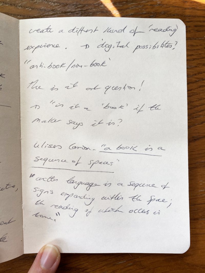 “Written language is a sequence of signs expanding within the space; the reading of which occurs in time”—quotes from The New Art of Making Books, Ulises Carrion (page 31)