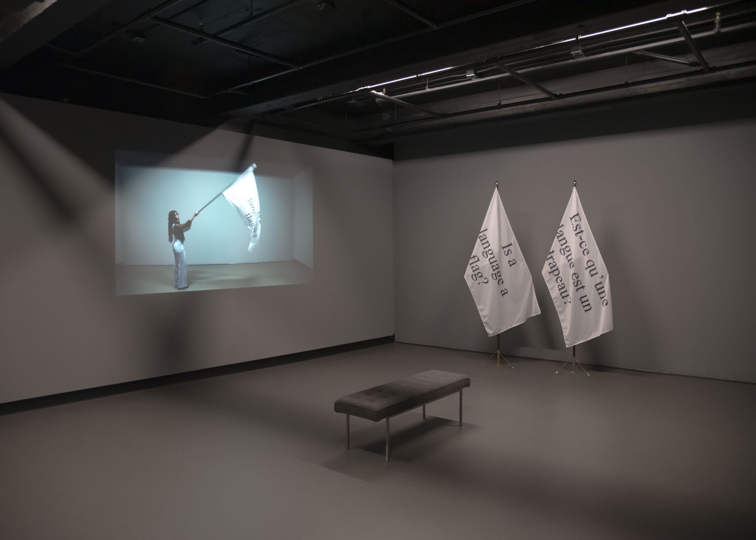The piece highlights the performative elements of language through the act of waving a flag – an act of patriotism that is associated with nationalism, a word that at once describes pride in one’s own nation – its history and culture – as well as the ills this feeling can engender when nationhood is understood in terms that fuel division and dispossession, and all too often ultimately result in violence.