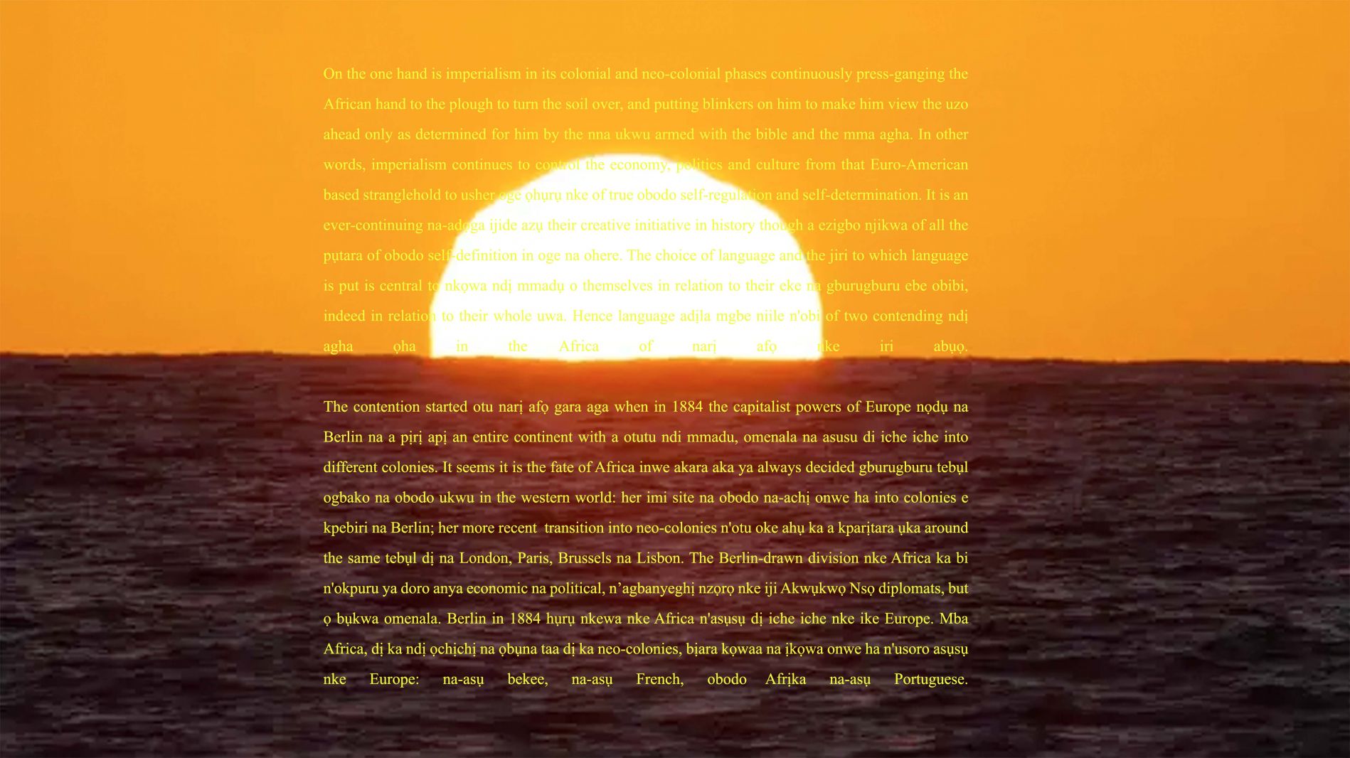 Over the image of a half-sun – a rising sun – wa Thiong’o’s musings on neo-colonialism and language slowly fade from English to Igbo.