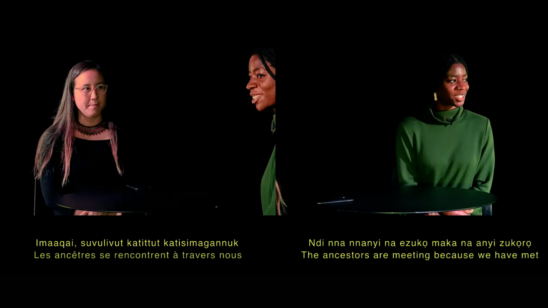Watch an excerpt of “Ndi nna nnanyi na ezuko maka na anyi zukoro / Imaaqai, suvulivut katittut katisimagannuk / The ancestors are meeting because we have met”, by Kosisochukwu Nnebe (in collaboration with Katherine Takpannie)